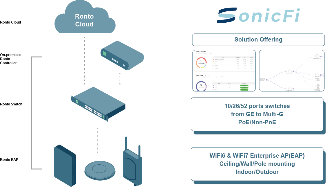 Ronto 企業解決方案是 SoniciFi 為中小企業客戶開發的通訊解決方案。此方案包含 SoniciFi 的四大產品組合:WiFi EAP、乙太網路交換器、本地網關和雲端控制軟體。此方案強調簡易安裝、非接觸式設定、不間斷故障排除和自動化配置,以實現最佳使用者體驗。整個系統從中心到邊緣均配備了 AI 驅動機制。這些軟體感測器將來自各個角落的網路狀況傳回網關和控制軟體,快速計算並將最佳網路設定發送回每個裝置進行調整。系統管理可分為本地控制器和各種基於雲端的管理選項,以滿足中小企業場景下的部署和維運需求。