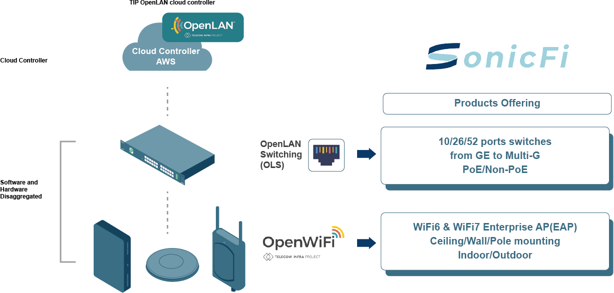IP OpenLAN 解決方案旨在擺脫封閉的專有系統,轉向基於電信基礎設施專案 (TIP) OpenLAN 開源社群定義的軟體的開放式、解耦式架構。該解決方案整合了 SonicFi 的全系列產品、來自不同供應商的各種設備軟體以及雲端控制系統,從而形成適用於各種中大型客戶場景的網路部署方案。